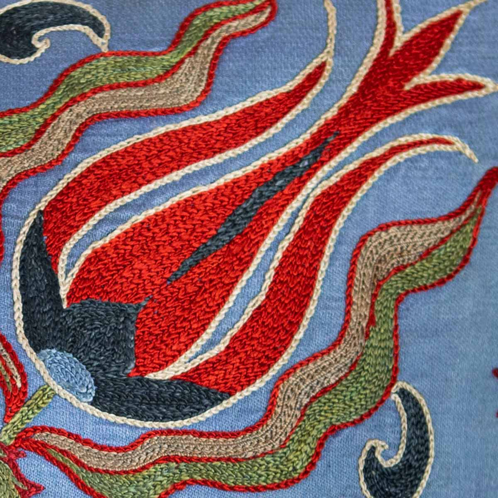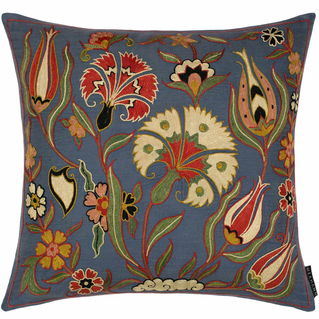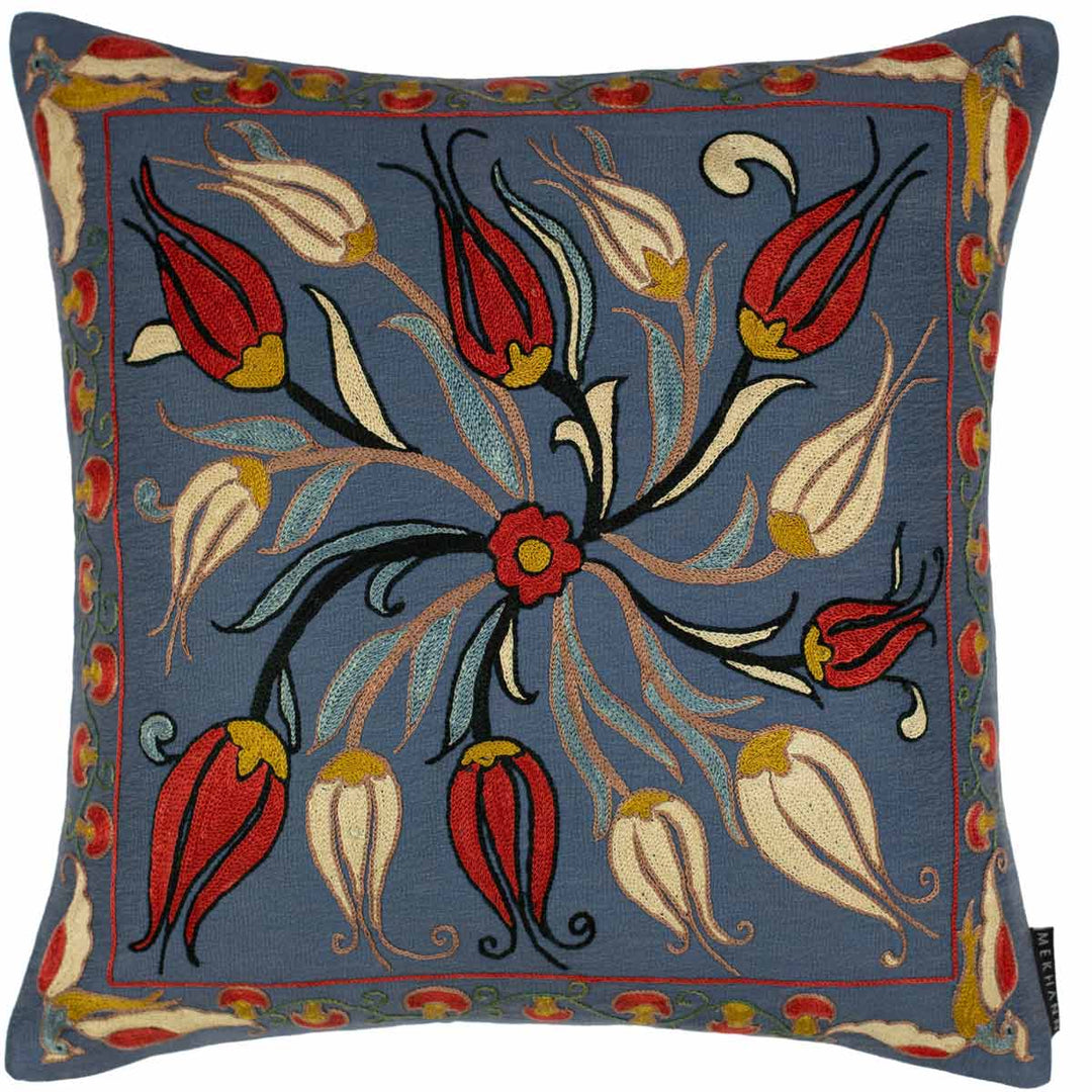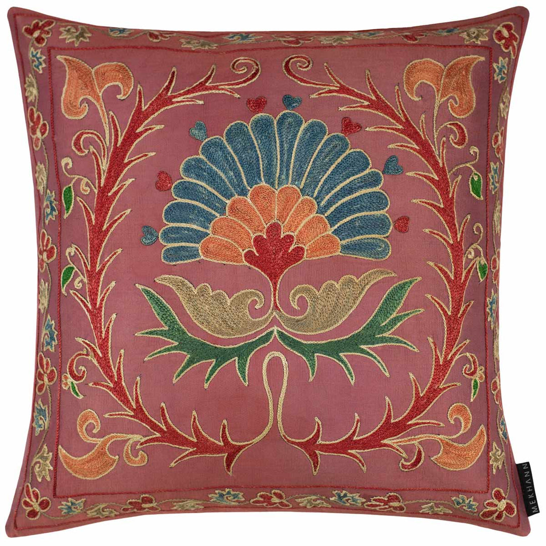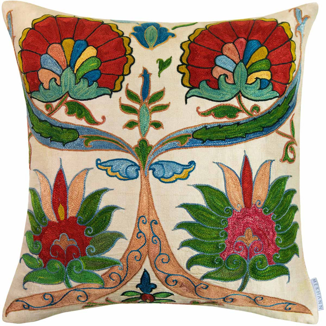 Mekhann’s hand-embroidered cushions are individually composed on silk using the traditional chain stitch technique, refined through a contemporary lens.